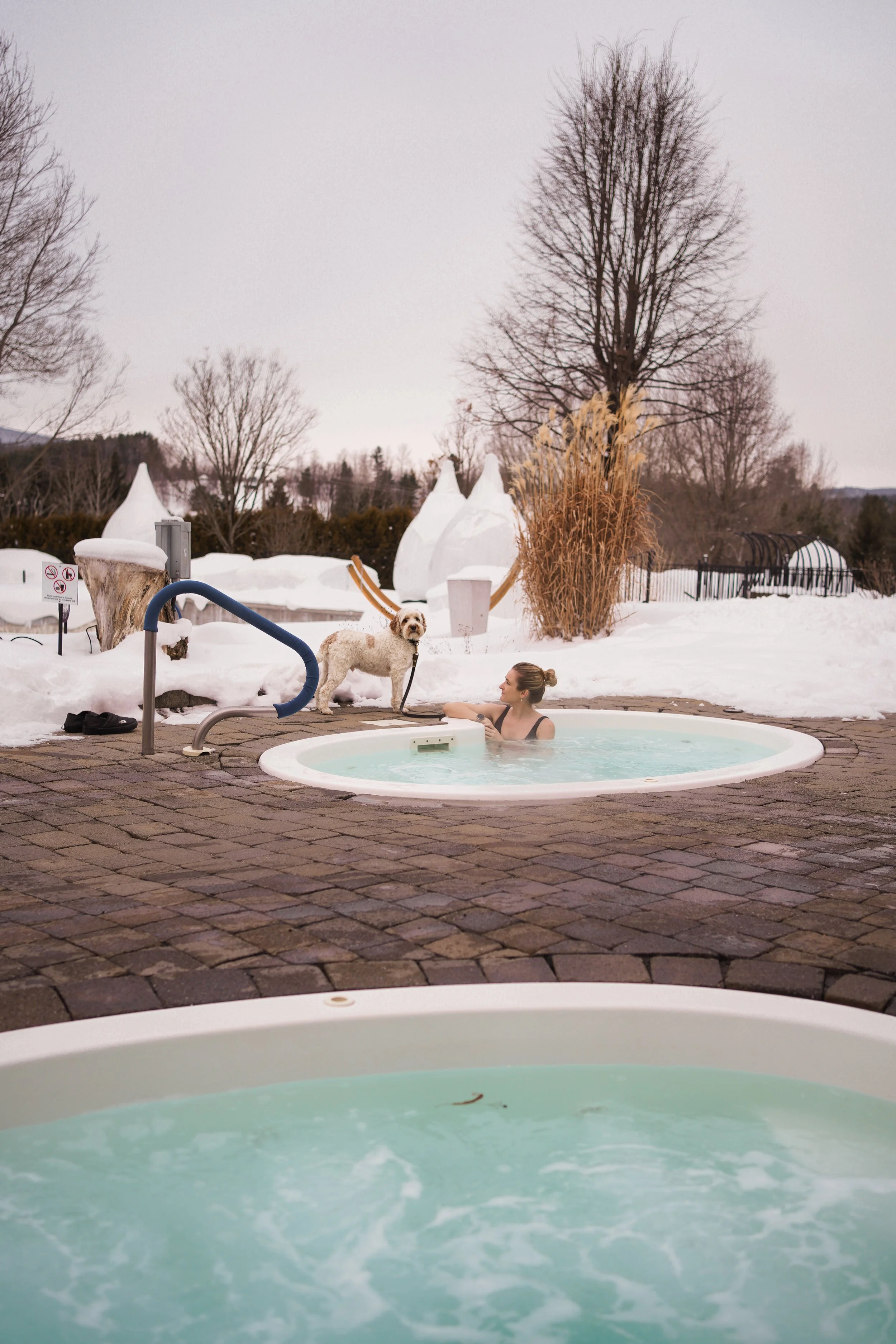 Les moments de détente étaient au rendez-vous avec l’accès aux piscines et bains de l’hôtel. Nous avons pu essayer la nouvelle piscine extérieure chauffée, parfaite pour se relaxer en plein hiver, et avoir les chiens tout près de nous. Cette fois, nous avons fait un tour à leur grande piscine intérieure, où les chiens étaient aussi autorisés (évidemment hors de l’eau). Tout est pensé pour qu’on ne les laisse jamais derrière!