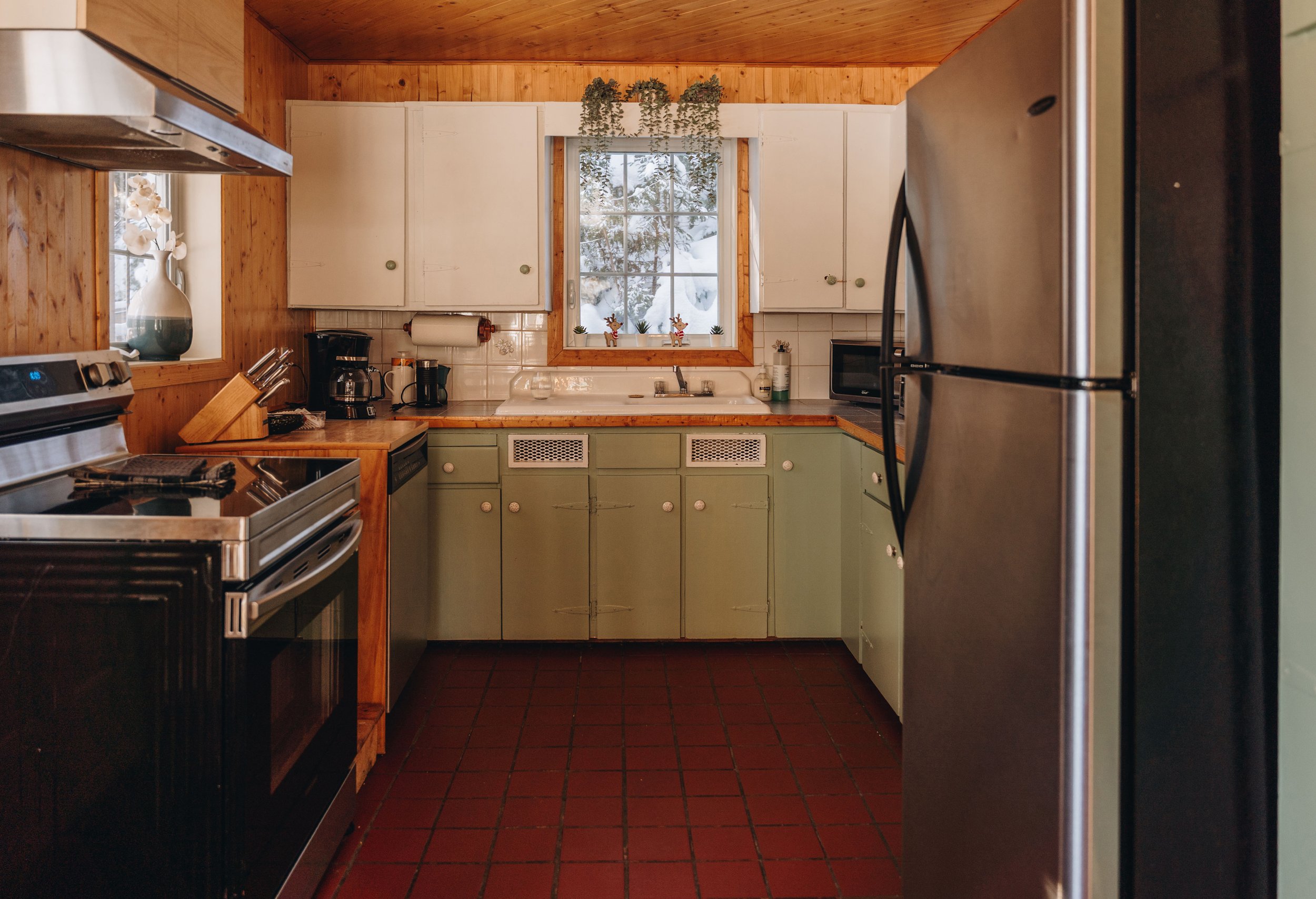 Au bout de la pièce, la cuisine en U dégage un charme antique assumé, avec ses armoires qui semblent avoir une histoire. Mais derrière ce look vintage, tout y est. Beaucoup de vaisselle, une foule d’ustensiles, des petits électroménagers, un lave-vaisselle (merci), et plusieurs options pour le café: italienne, filtre, capsules, piston. On a cuisiné sans jamais manquer de rien.