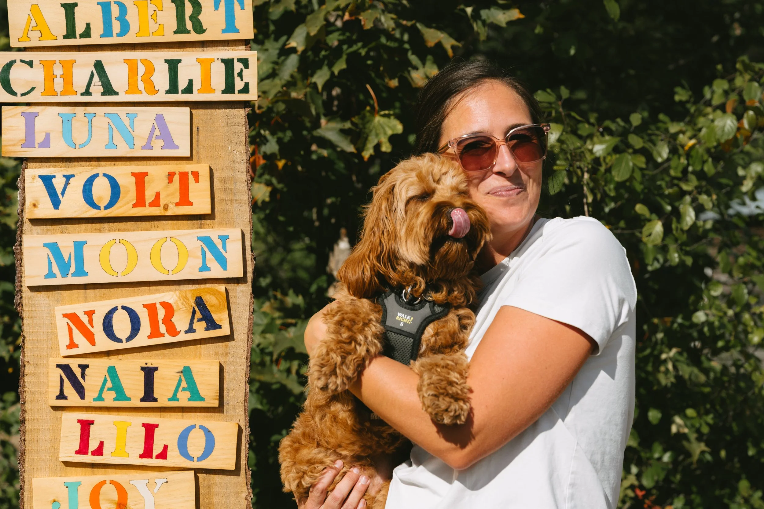 Catherine, la propriétaire, est d’une grande gentillesse : elle prépare de l’eau fraîche pour les chiens et collectionne même des pancartes portant le nom de chaque visiteur canin à l’entrée du sentier, rendant chaque visite unique et mémorable.