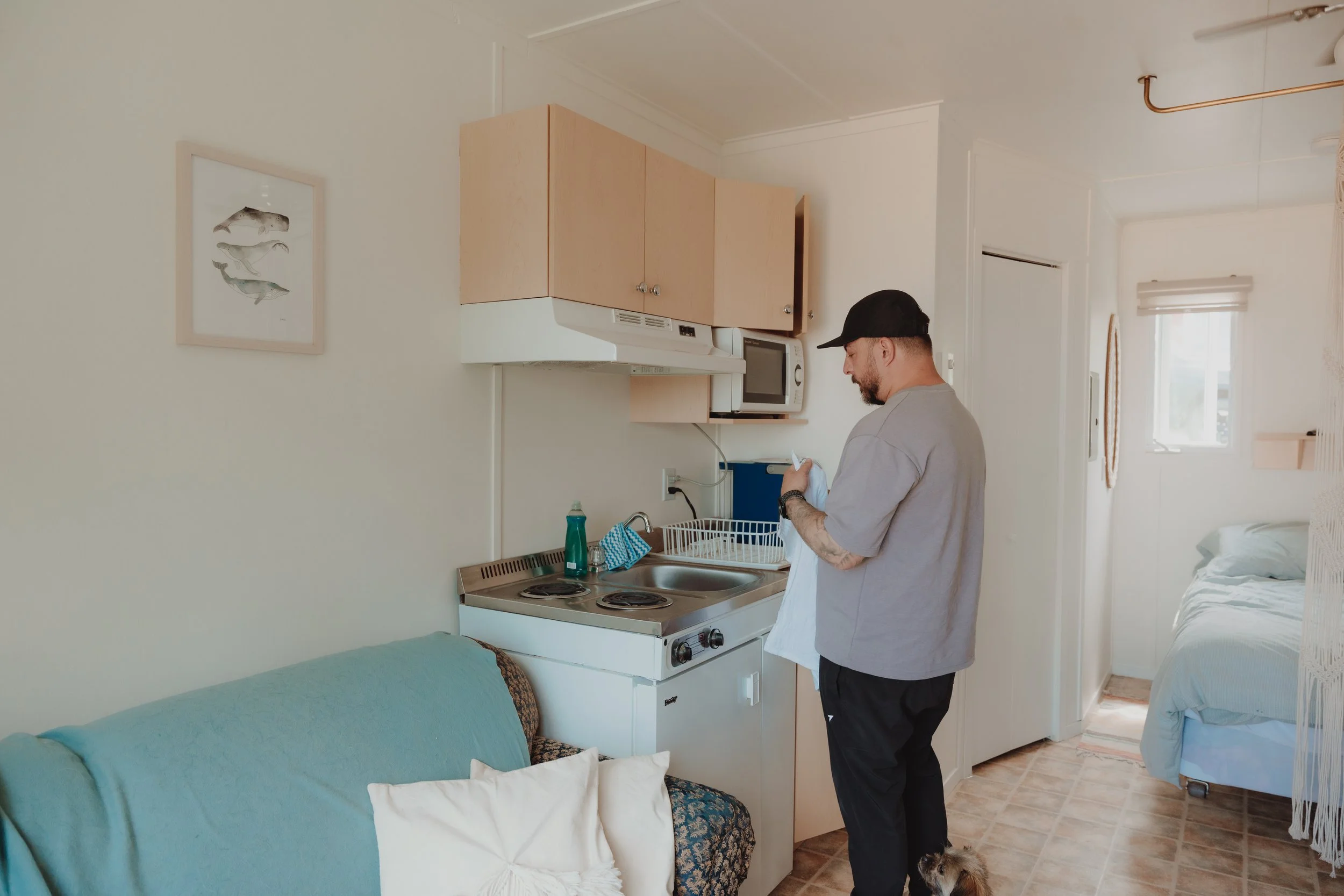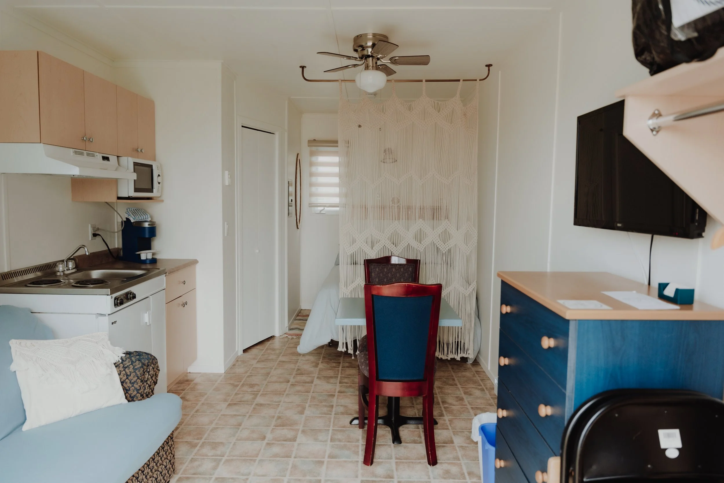 La cuisinette comprend un petit poêle, un frigo, un micro-ondes, une cafetière, un grille-pain et toute la vaisselle nécessaire pour cuisiner : assiettes, verres, chaudrons, ustensiles… On ne manquait de rien. La salle de bain est complète, et il y a du Wi-Fi, ce qui était parfait pour une journée plus tranquille, où j’ai pu avancer un peu mon travail photo.