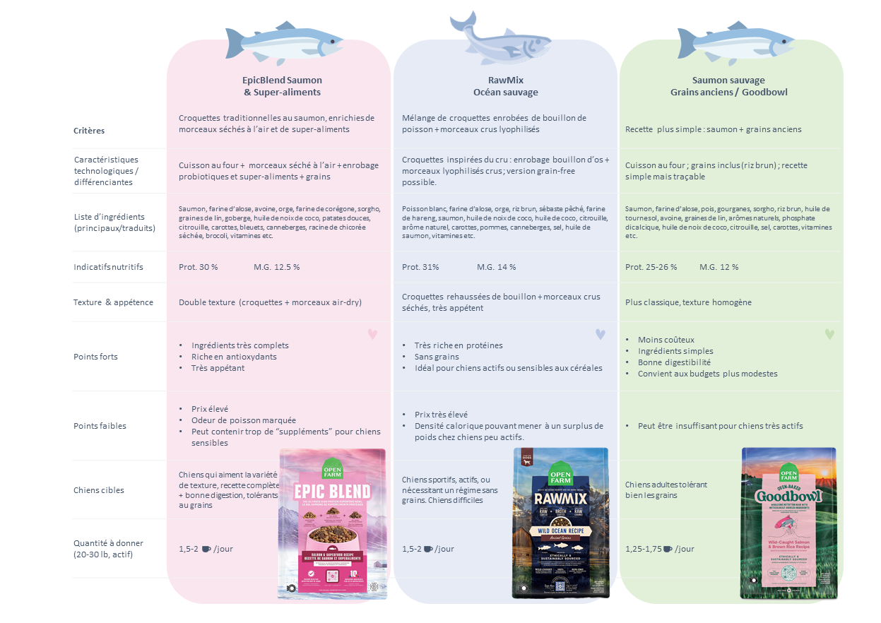Dans le but d’aider les propriétaires à choisir la meilleure nourriture pour leur compagnon, nous avons réalisé une étude comparative des différentes croquettes à base de poisson offertes par Open Farm.